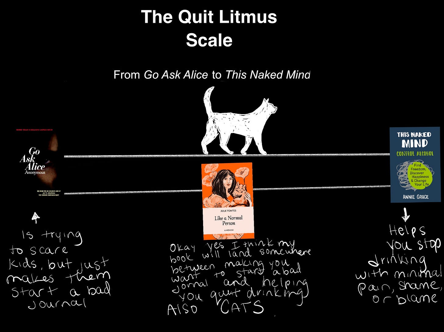 I’m considering how I want to discuss the books I get to read in the quit-lit genre now that I’m mostly done writing mine. I’m reading all of them with the assumption that they are good and important and worth reading. The Quit Litmus Scale I’ve invented measures these books on a scale from Go Ask Alice to This Naked Mind by Annie Grace.